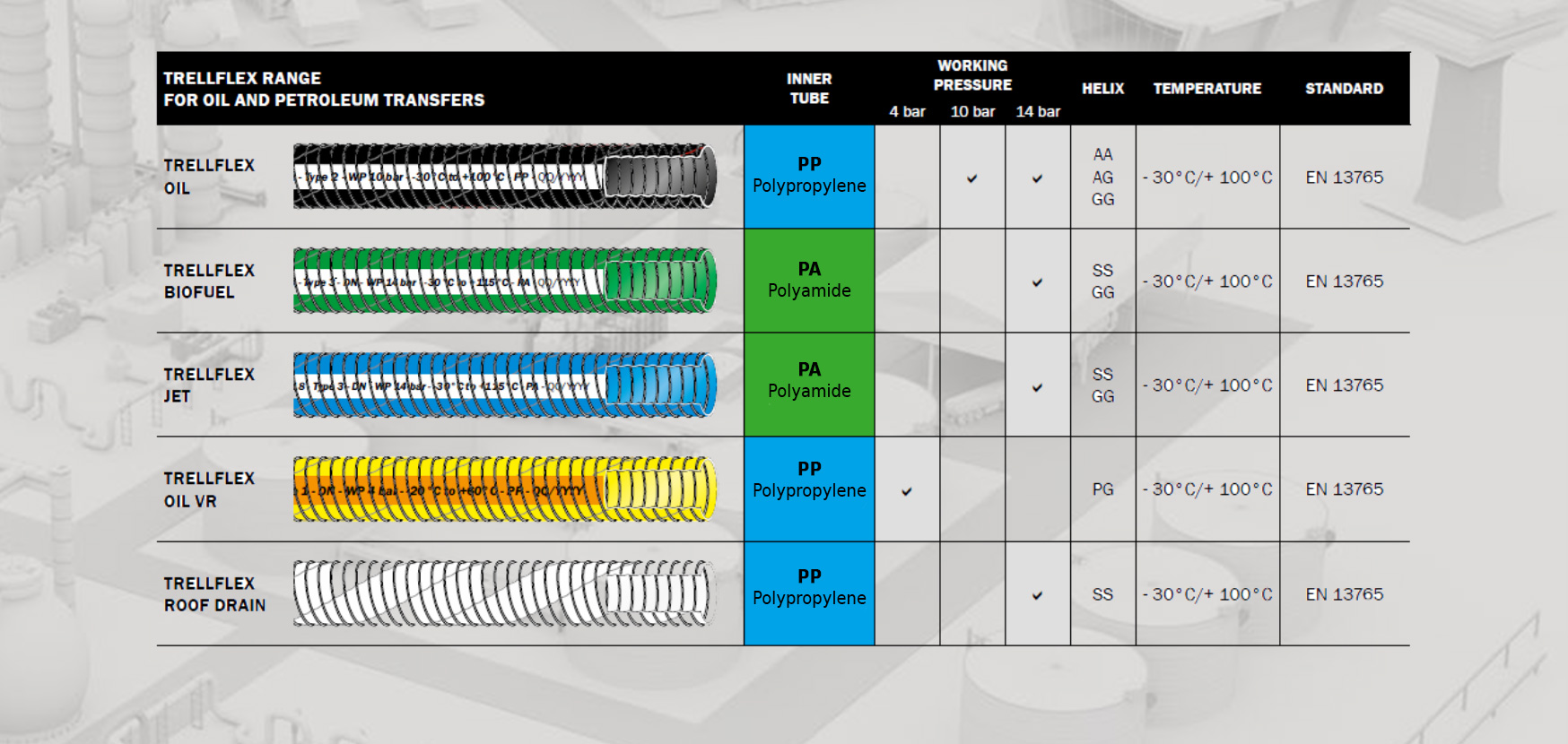 TRELLFLEX composite hoses are designed from multi layers of foils wrapped between two steel wire helix. The wires coating and the type of foil (PP, PA, PTFE) are optimized to resist to petroleum, chemicals and the application requirements.